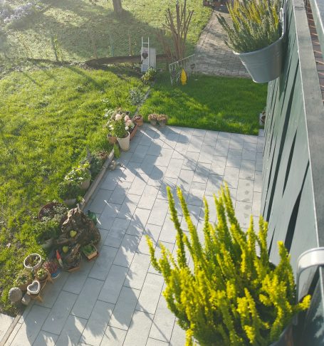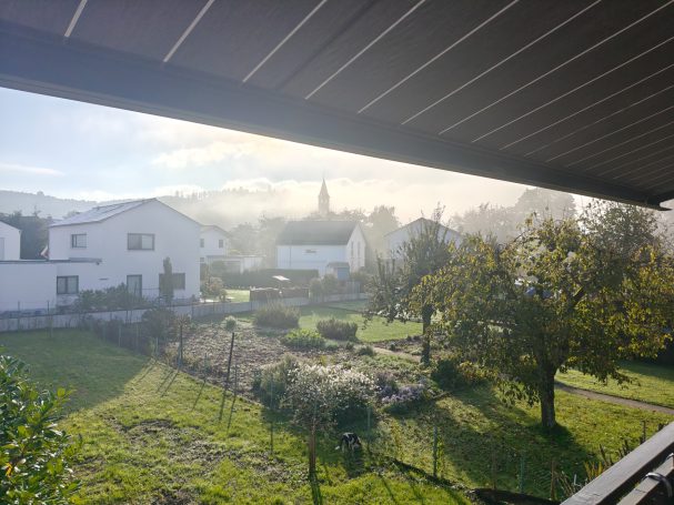 Balkon mit Gartenblick und herrlicher Aussicht auf die umliegenden Weinberge, die Kapelle und die Dorfkirche. - Der Balkon ist ausgestattet mit Sitzmöbeln sowie einer Sonnenliege. - Beim morgendlichen Frühstück oder tagsüber spendet die große Markise Schatten und kann mittels Fernbedienung gesteuert werden.