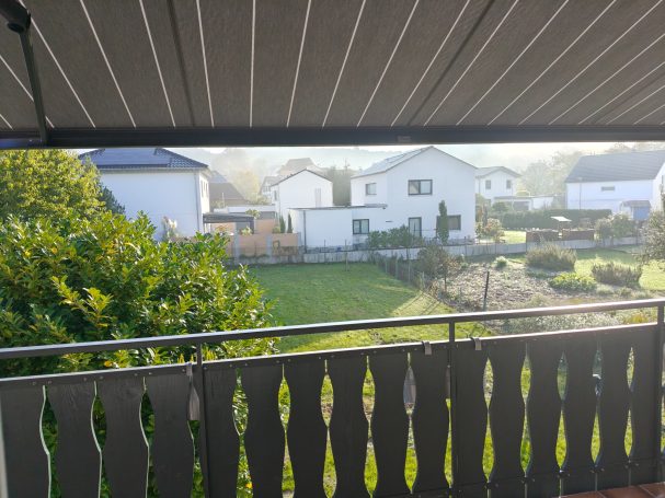 Balkon mit Gartenblick und herrlicher Aussicht auf die umliegenden Weinberge, die Kapelle und die Dorfkirche. - Der Balkon ist ausgestattet mit Sitzmöbeln sowie einer Sonnenliege. - Beim morgendlichen Frühstück oder tagsüber spendet die große Markise Schatten und kann mittels Fernbedienung gesteuert werden.